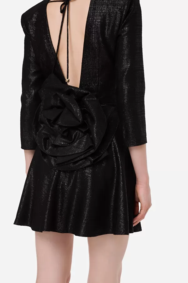 Mini-robe en tweed lurex avec une large encolure qui souligne le décolleté et se prolonge à l’arrière en découvrant le dos. La découpe juste au-dessus de la taille donne naissance à une jupe corolle courte. Un détail de style important réside dans la maxi rose au bas du dos qui confère un look couture au vêtement. Les manches sont de longueur 3⁄4.