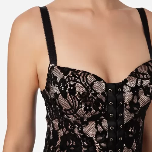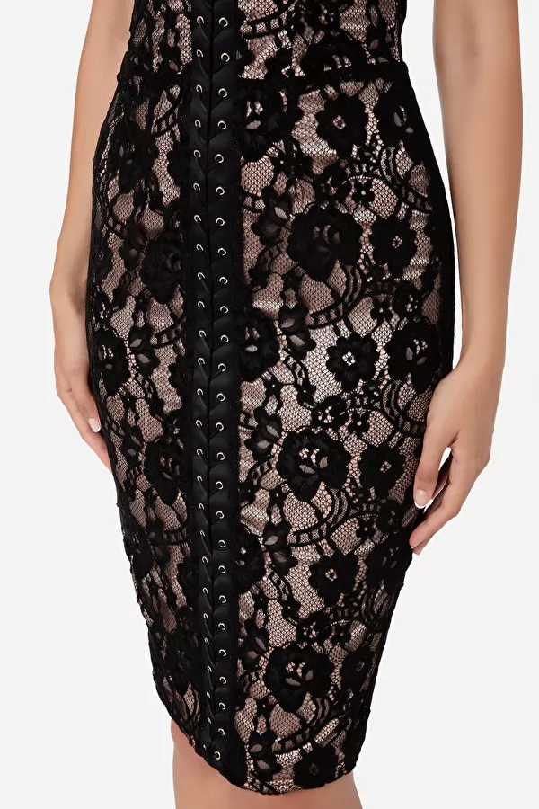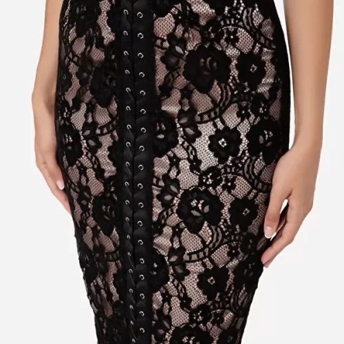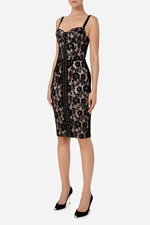 Robe fourreau en dentelle rebrodée de velours avec de fines bretelles de maintien. La pièce présente un laçage croisé sur le devant en lacet brillant de couleur assortie qui part de l’encolure jusqu’au fond et évoque un effet de corseterie. Longueur au-dessous du genou.