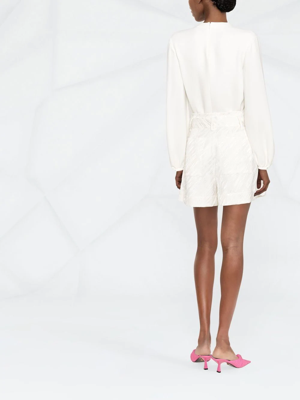 Blanc cassé, soie, encolure ronde à détail de fente, détails de chaînes, finitions en métal doré, manches longues.